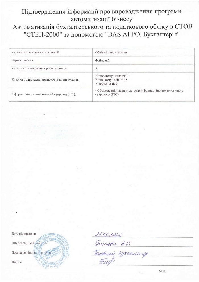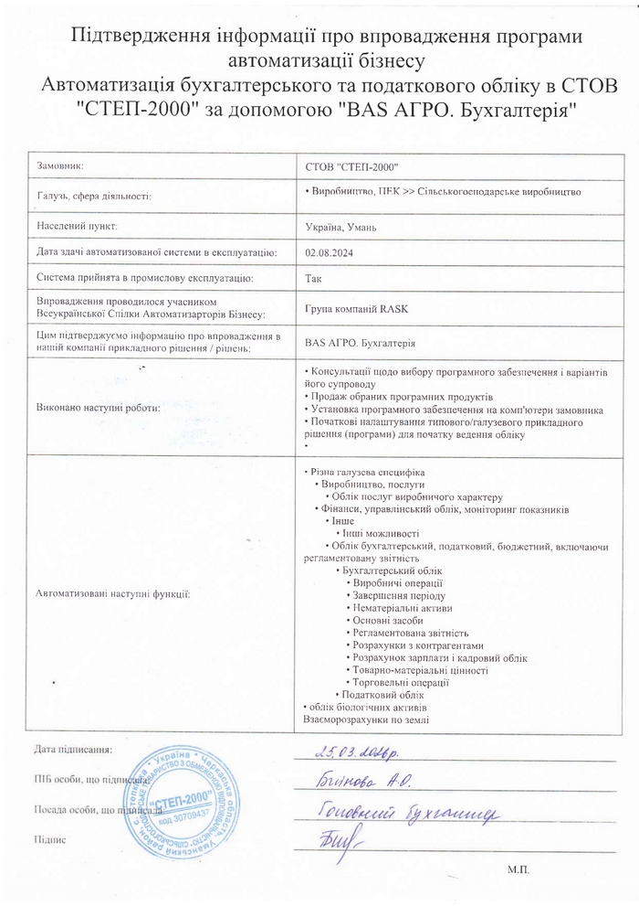 Автоматизація бухгалтерського та податкового обліку в СТОВ "СТЕП-2000" за допомогою "BAS АГРО. Бухгалтерія"