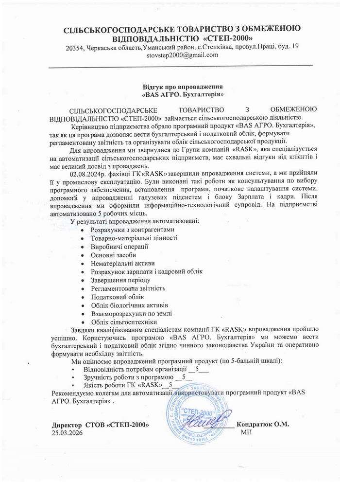 Завдяки кваліфікованим спеціалістам компанії ГК «RASK» впровадження пройшло успішно. Користуючись програмою «BAS АГРО. Бухгалтерія» ми можемо вести бухгалтерський і податковий облік згідно чинного законодавства України та оперативно формувати необхідну звітність.