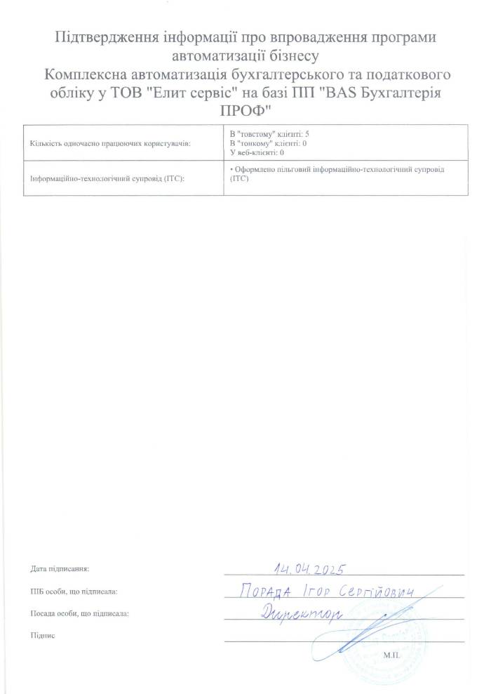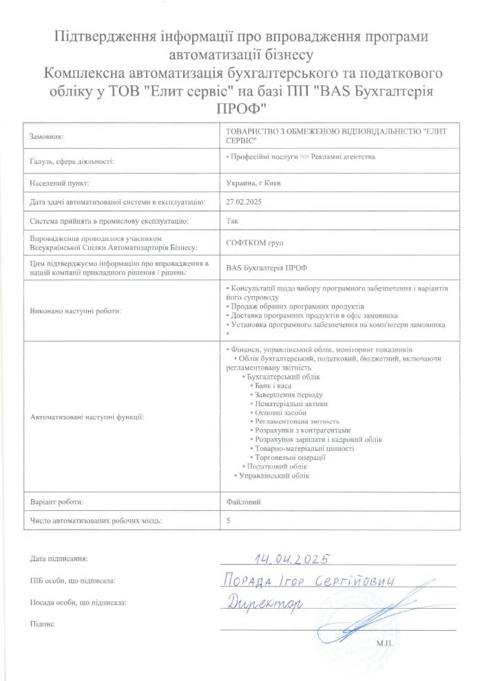 Комплексна автоматизація бухгалтерського та податкового обліку у ТОВ "Елит сервіс" на базі ПП "BAS Бухгалтерія ПРОФ"