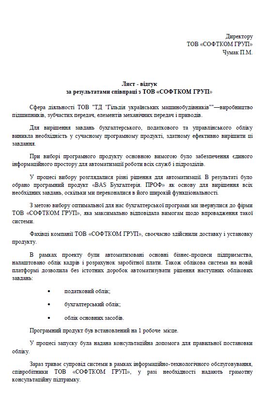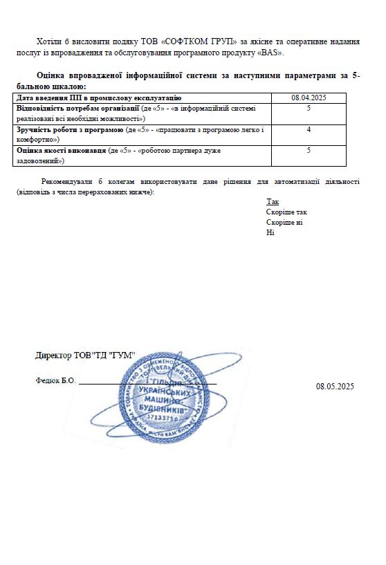 Хотіли б висловити подяку ТОВ «СОФТКОМ ГРУП» за якісне та оперативне надання послуг із впровадження та обслуговування програмного продукту «BAS».