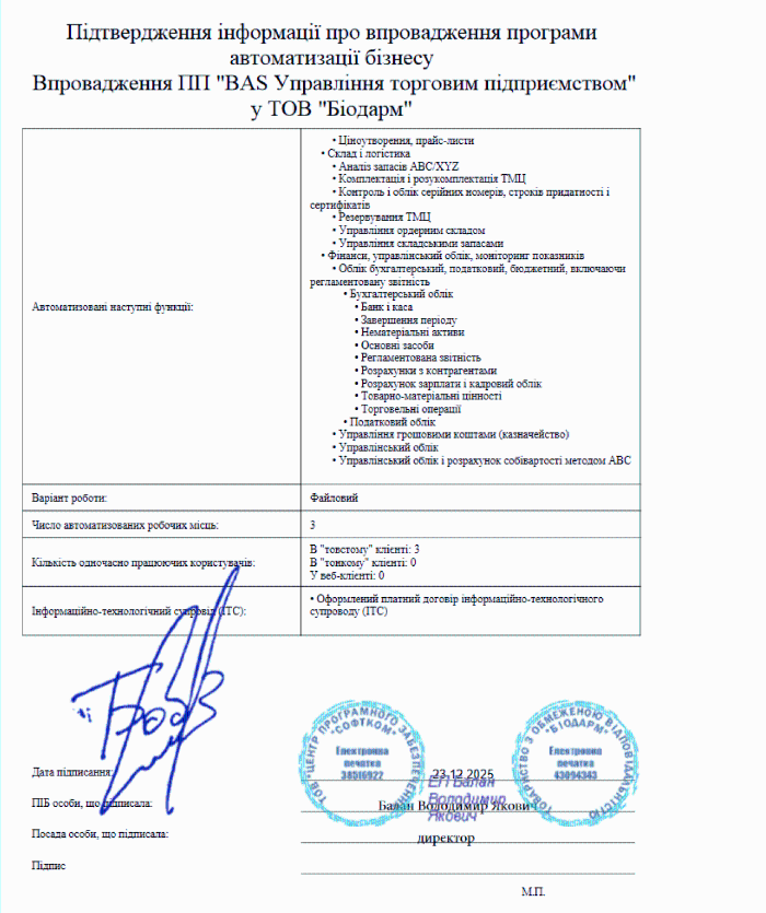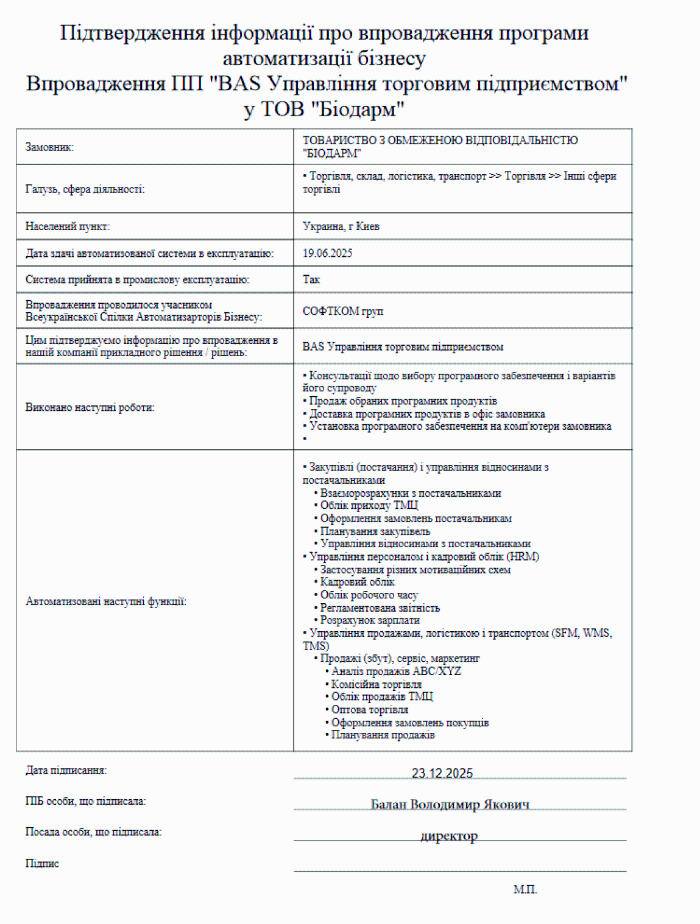 Впровадження ПП "BAS Управління торговим підприємством" у ТОВ "Біодарм"