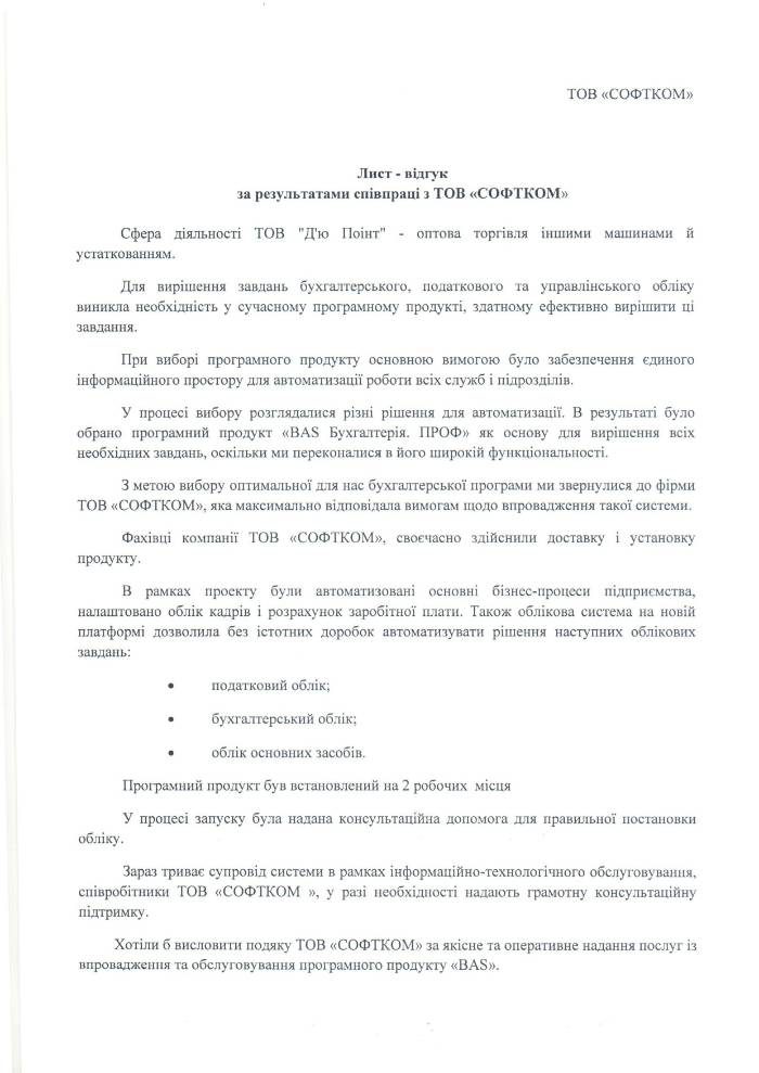 Хотіли б висловити подяку ТОВ «СОФТКОМ» за якісне та оперативне надання послуг із впровадження та обслуговування програмного продукту «BAS».