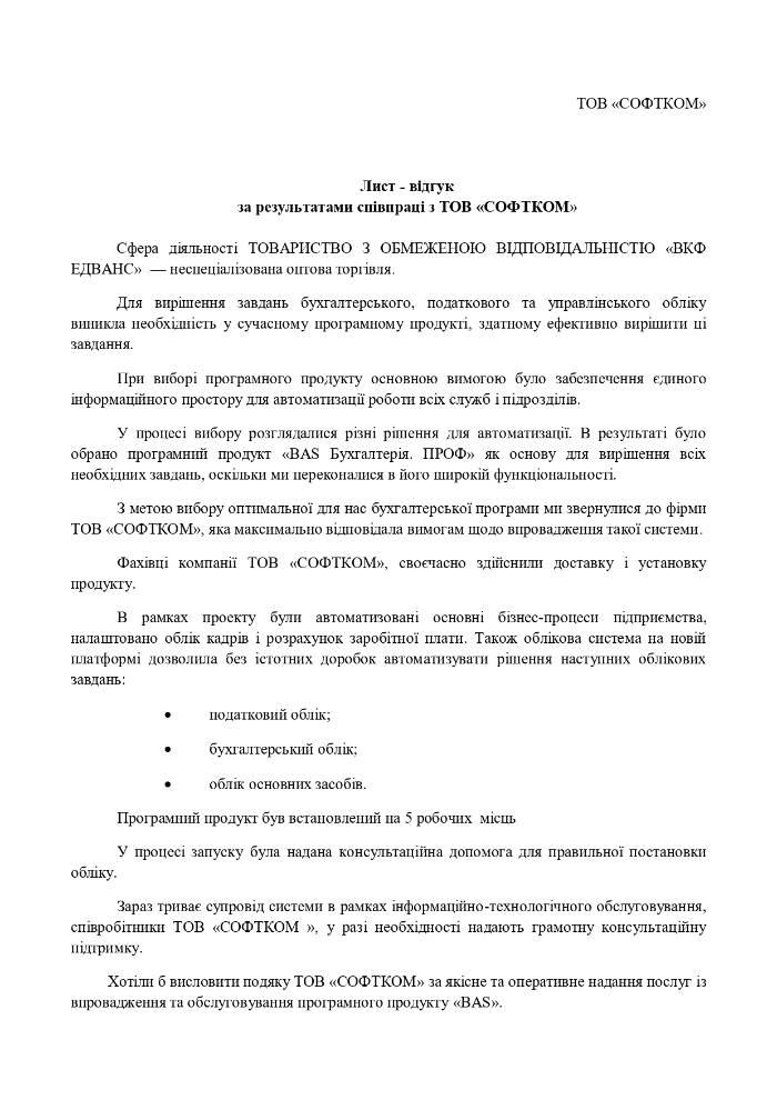 Хотіли б висловити подяку ТОВ «СОФТКОМ» за якісне та оперативне надання послуг із впровадження та обслуговування програмного продукту «BAS».
