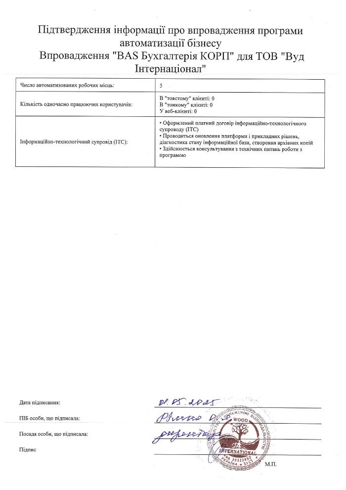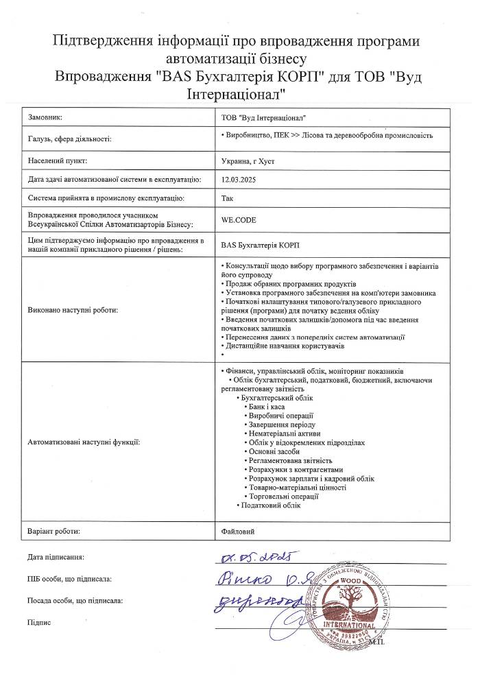 Впровадження "BAS Бухгалтерія КОРП" для ТОВ "Вуд Інтернаціонал"