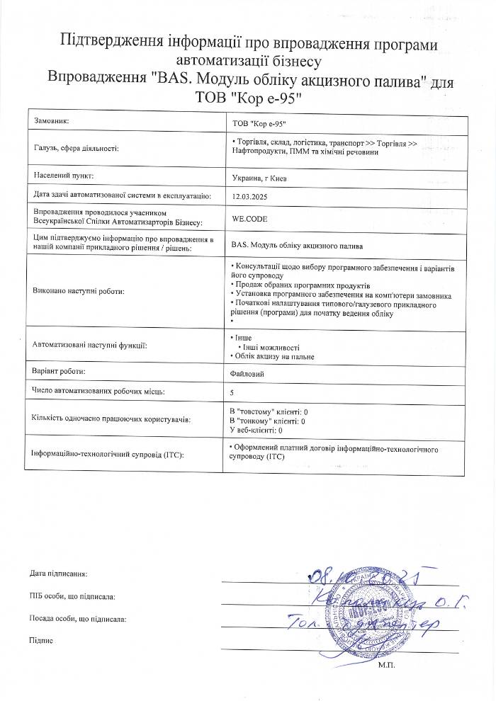 Впровадження "BAS. Модуль обліку акцизного палива" для ТОВ "Кор е-95"