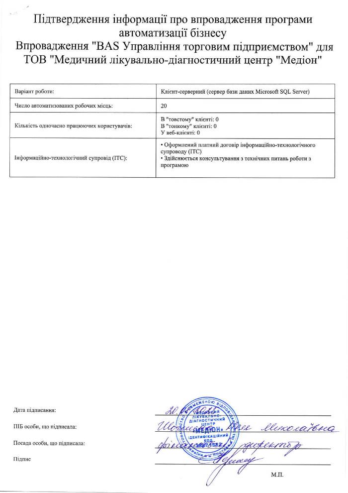 Впровадження "BAS Управління торговим підприємством" для ТОВ "Медичний лікувально-діагностичний центр "Медіон"