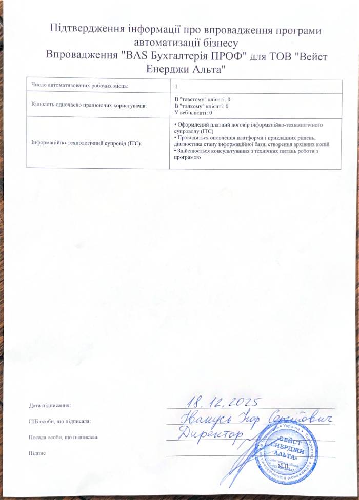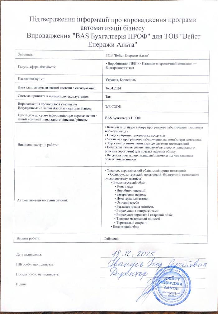Впровадження "BAS Бухгалтерія ПРОФ" для ТОВ "Вейст Енерджи Альта"