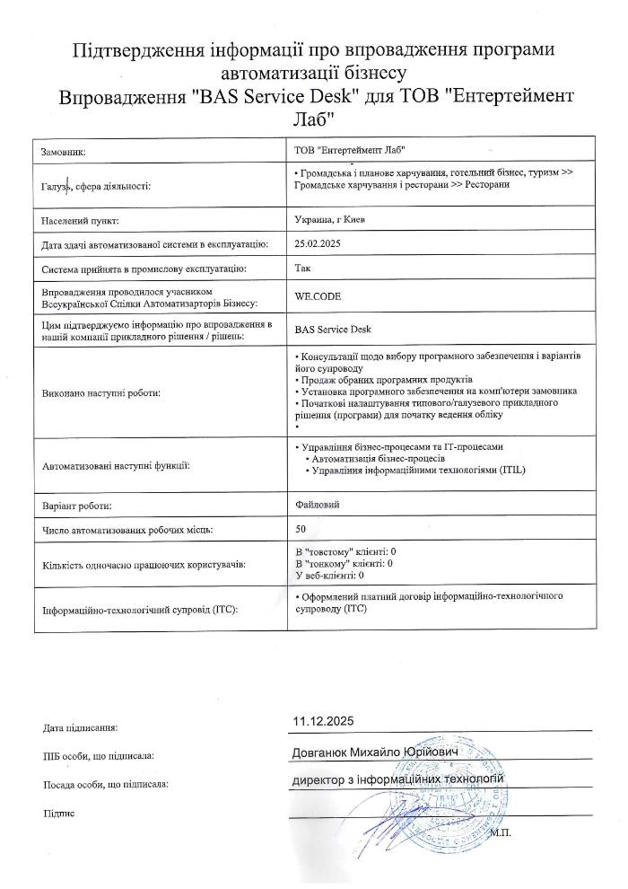 Впровадження "BAS Service Desk" для ТОВ "Ентертеймент Лаб"