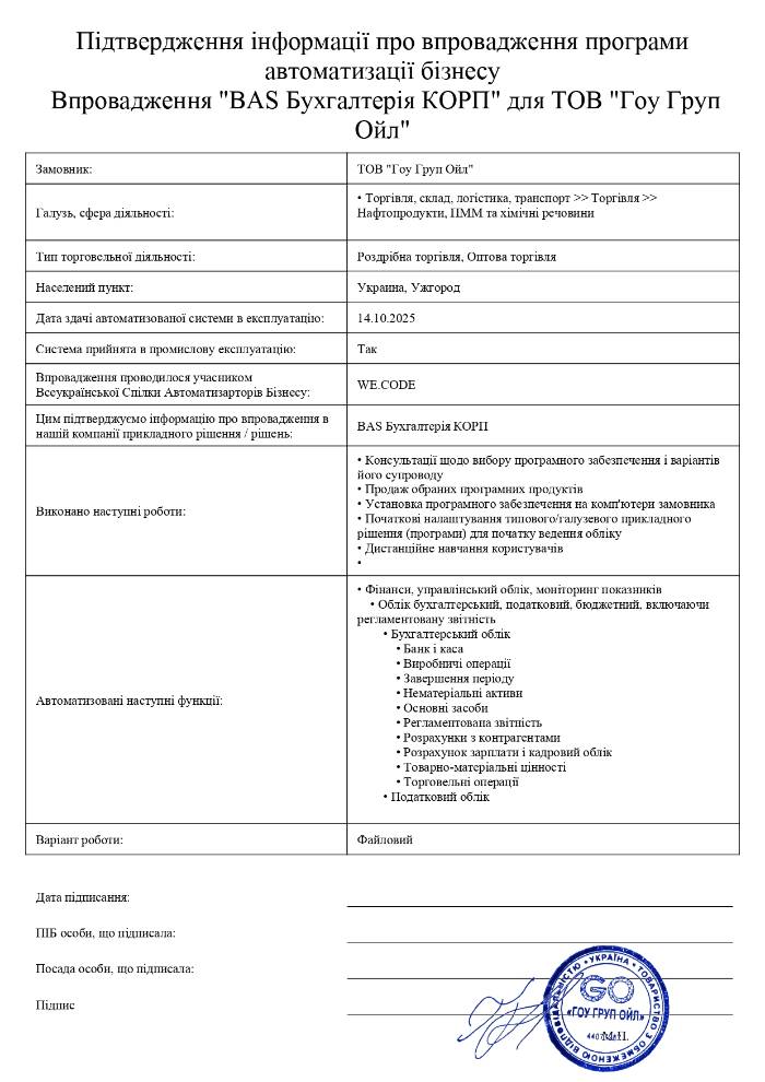 Впровадження "BAS Бухгалтерія КОРП" для ТОВ "Гоу Груп Ойл"