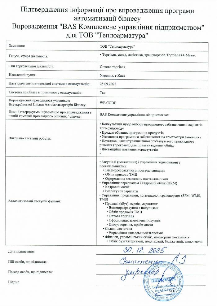 Впровадження "BAS Комплексне управління підприємством" для ТОВ "Теплоарматура"