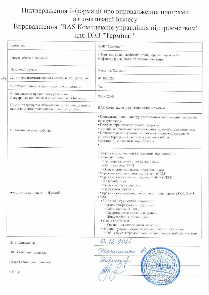 Впровадження "BAS Комплексне управління підприємством" для ТОВ "Термінал"