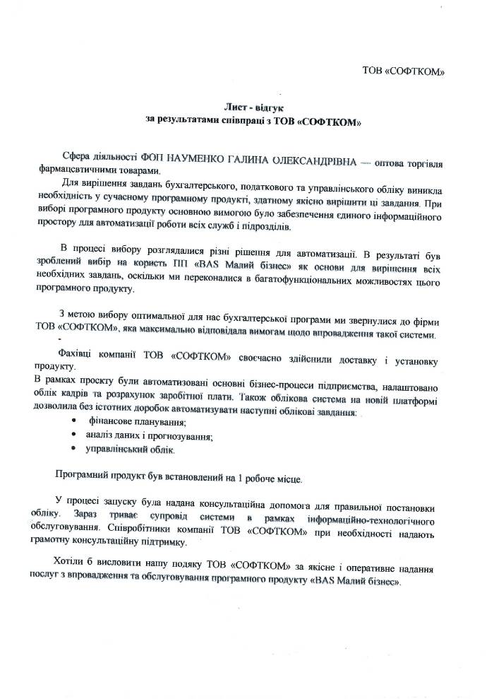 Хотіли б висловити нашу подяку ТОВ «СОФТКОМ» за якісне і оперативне надання послуг з впровадження та обслуговування програмного продукту «BAS Малий бізнес».
