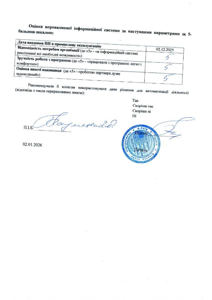 Оцінка впровадженої інформаційної системи за наступними параметрами за 5-бальною шкалою: